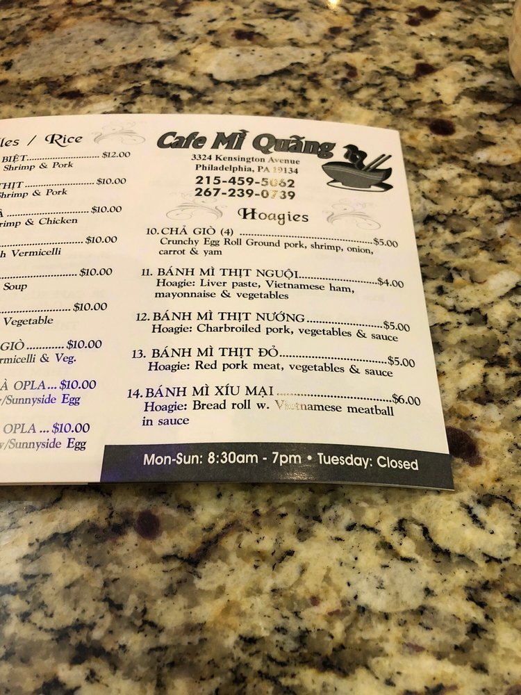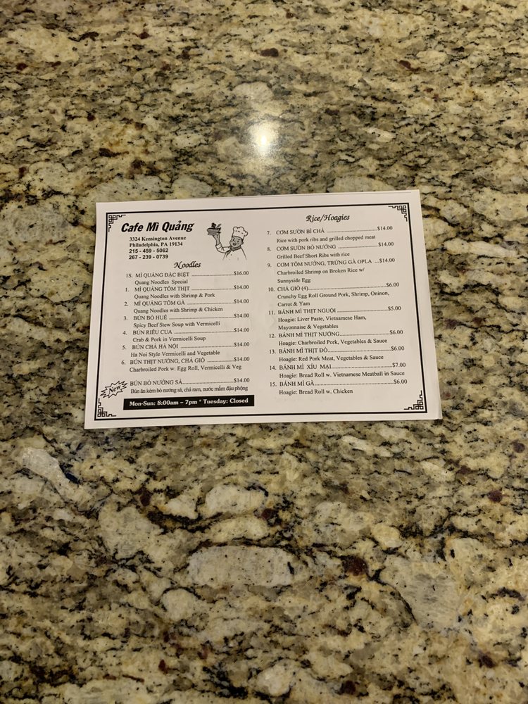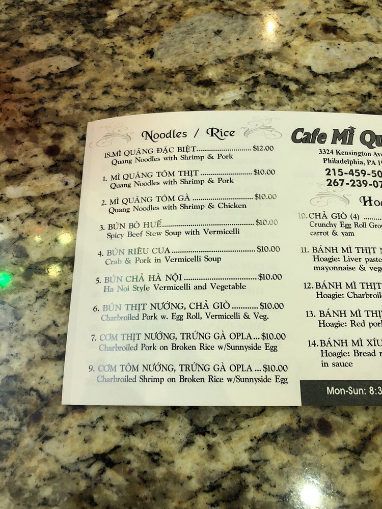 Welcome to Cafe Mi Quang, your go-to destination for authentic Vietnamese cuisine nestled in Philadelphia's Kensington neighborhood. Specializing in Mi Quang, a signature dish featuring wide rice noodles and a rich turmeric broth, this cafe delivers a flavor-packed experience that will leave you craving more. Diners rave about the seafood ball and delectable chicken pho, complemented by fresh herbs and a crispy sesame rice cracker.
